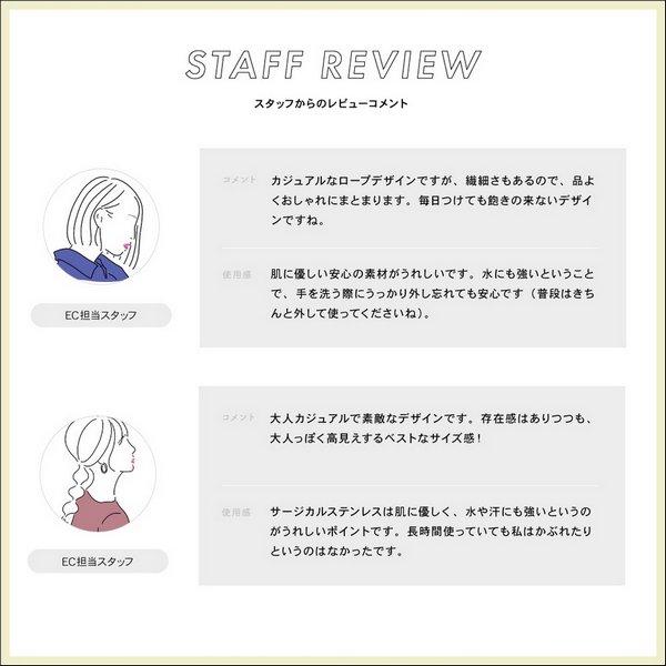 別のオンラインショップでシルバーを購入して気に入ってゴールドをこちらで購入しました。手首細めの自分の腕にも丁度良く、チェーンも太すぎず細すぎずで重さもないので好きなのですが、ゴールドの色が別の店で買ったステンレス商品と微妙に違い、(ピンクゴールドっぽい)そこだけちょっと惜しいので星4で。