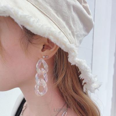 今年人気が爆発しているバケットハット。アイボリーのフリンジタイプは程よいカジュアルさを演出してくれます。オーロラカラーの大ぶりチェーンピアスは夏らしいトロピカルなアクセントに。
