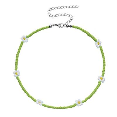 鮮やかなグリーンのカラーのビーズネックレスがポイント。