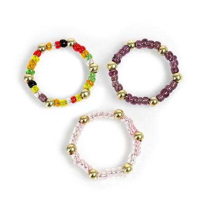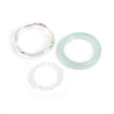 さわやかなアクリルリングとビーズアイテムで手元をまとめました。今年らしい旬のスタイリングです。
